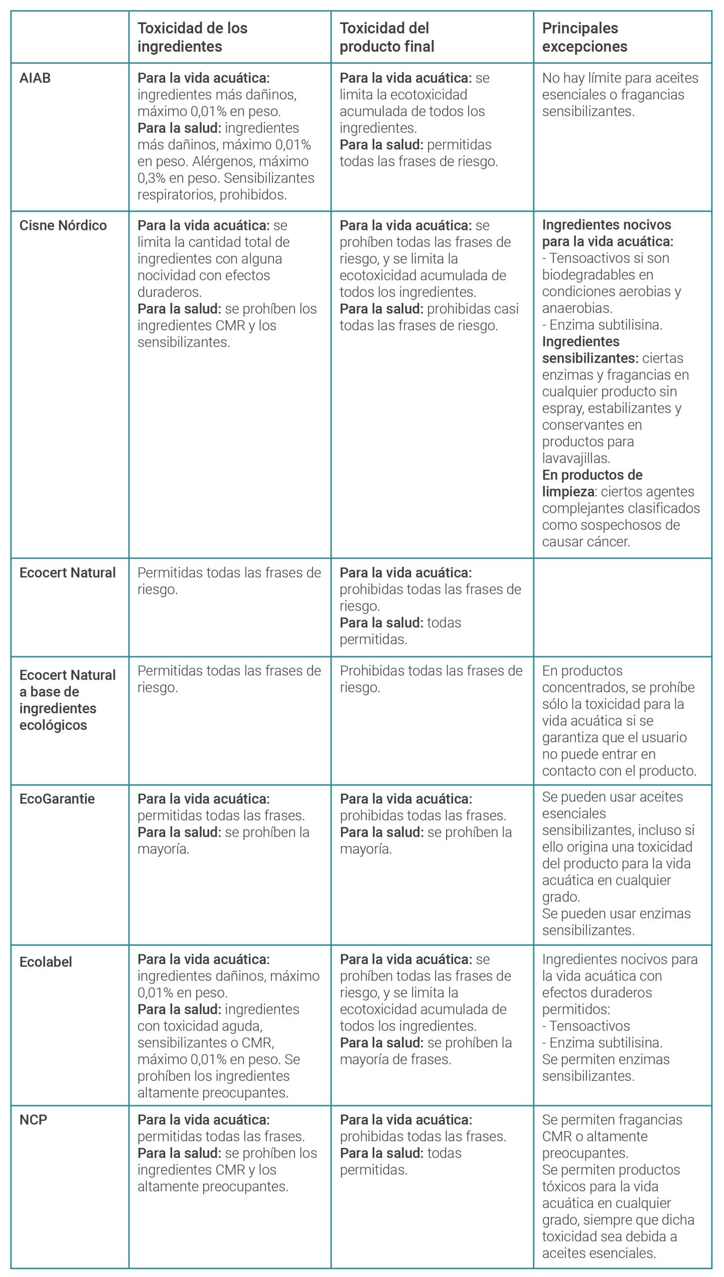 La tabla siguiente resume los criterios de los distintos sellos. Podemos ver que uno de los peligros para la salud que más se previene (5 de 7 sellos) es la sensibilización cutánea o respiratoria (alergia, asma u otras dificultades respiratorias). Pero a la vez la excepción más presente entre las normas es el permiso para incluir ingredientes sensibilizantes, sobre todo enzimas y aceites esenciales de plantas (ampliamente usados para obtener fragancias).